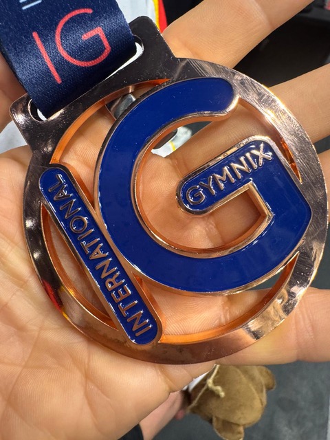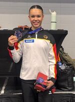 - Lara Baumgartel, das jüngste Teammitglied, startete im Bodenfinale gegen starke internationale Konkurrenz. Mit einer ausdrucksstarken und sauber geturnten Übung überraschte sie das Feld und sicherte sich einen hervorragenden dritten Platz. Damit durfte sie bei ihrem ersten internationalen Wettkampf direkt eine Medaille mit nach Hause nehmen.
