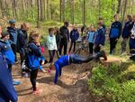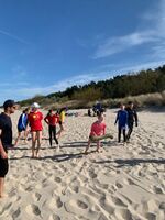 Eine besondere Aktion hatten sich die Trainer einfallen lassen. Angelehnt an die TV-Sendung „Ewige Helden“ wurde eine Challenge in Mannschaften durchgeführt. Disziplinen waren zum Beispiel das Hängen an den Armen an einem Ast, Liegestützhaltung mit erhöhter Beinposition, Dünenaufganglauf, Holzklotzwurf, Zielwurf durch eine Baumastgabel oder Schlusssprünge barfuß im Sand. Der Spaß kam dabei natürlich nicht zu kurz und die Siegermannschaft hatte sich eine extra Portion Eis verdient.
